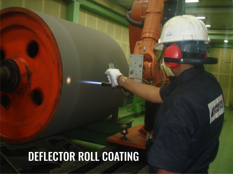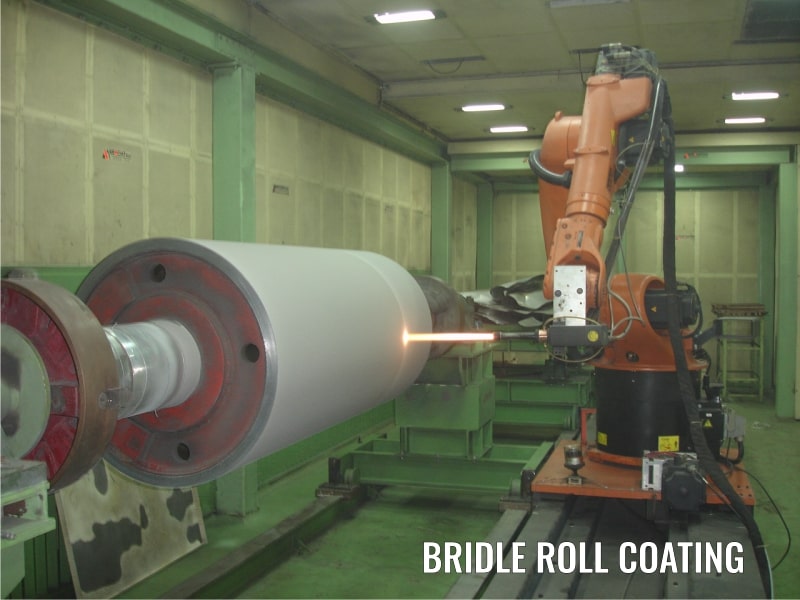 HP/HVOF coating systems mounted on robots are used to provide uniform and very dense Tungsten Carbide and Ceramic base coating on roll surfaces. These coatings are done in an acoustic spray booth.